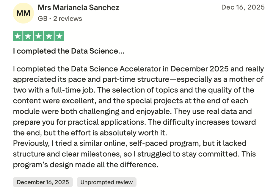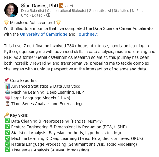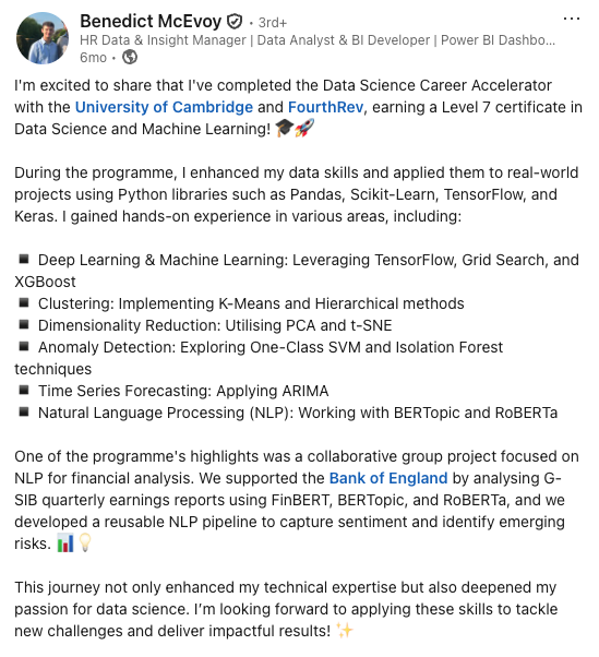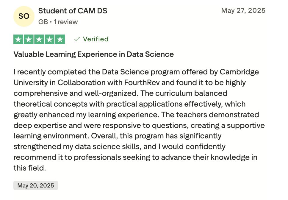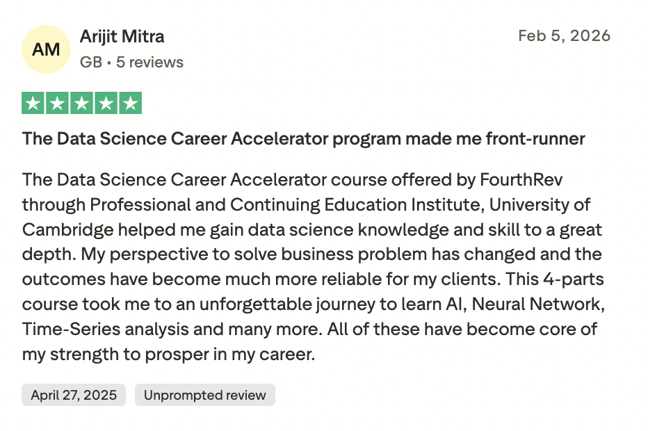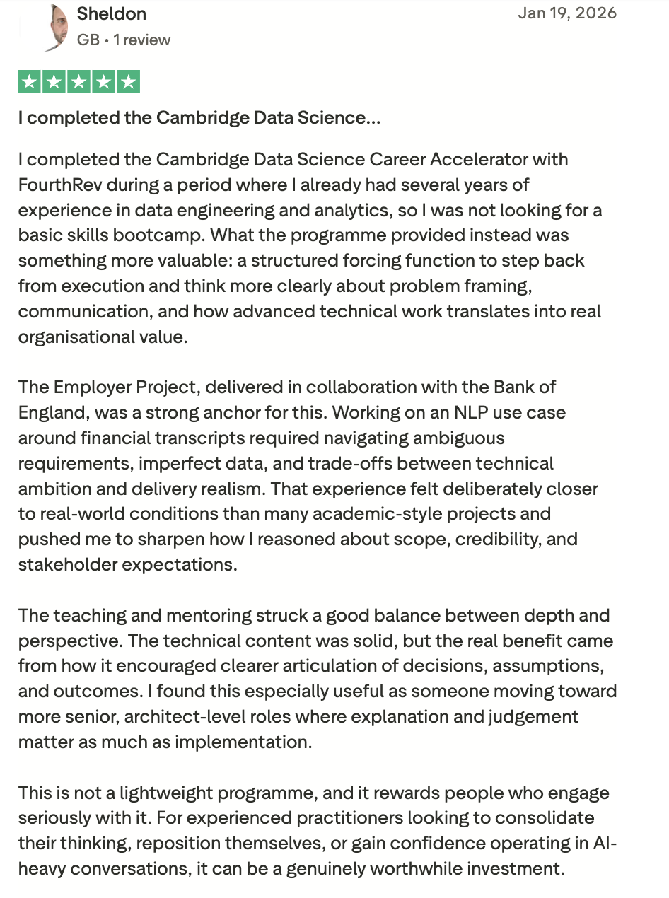 “This Data Science Career Accelerator from University of Cambridge Professional and Continuing Education is focused on shaping the future of business through data. It's not just about algorithms, statistics, or utilising AI and machine learning techniques; it’s also about generating meaningful, actionable insights that can challenge conventional wisdom and enable commercial success”